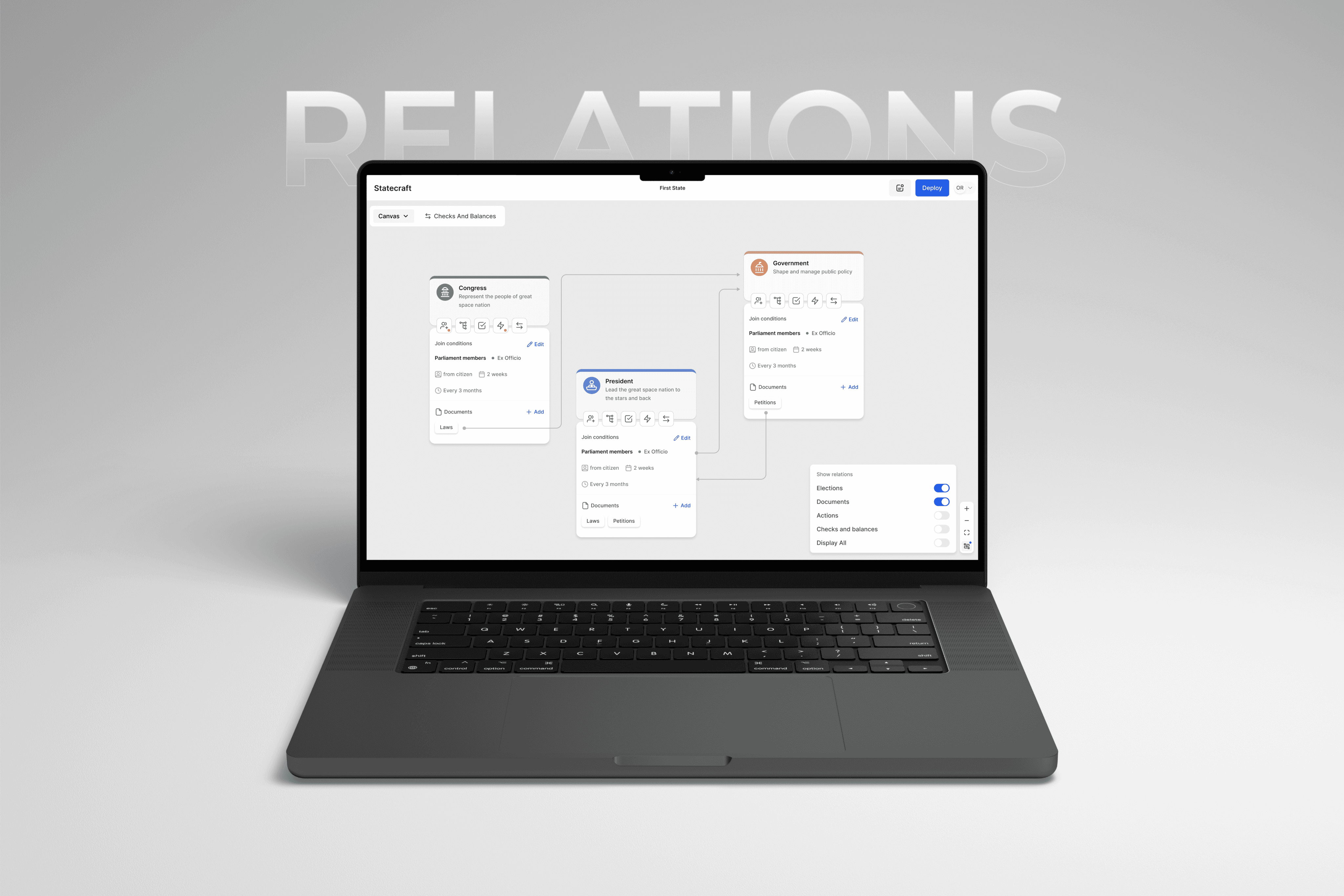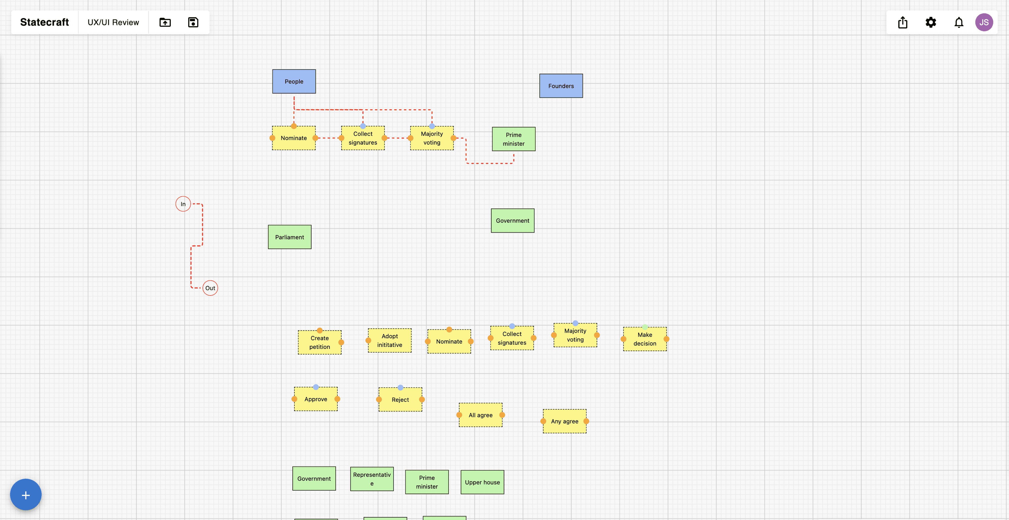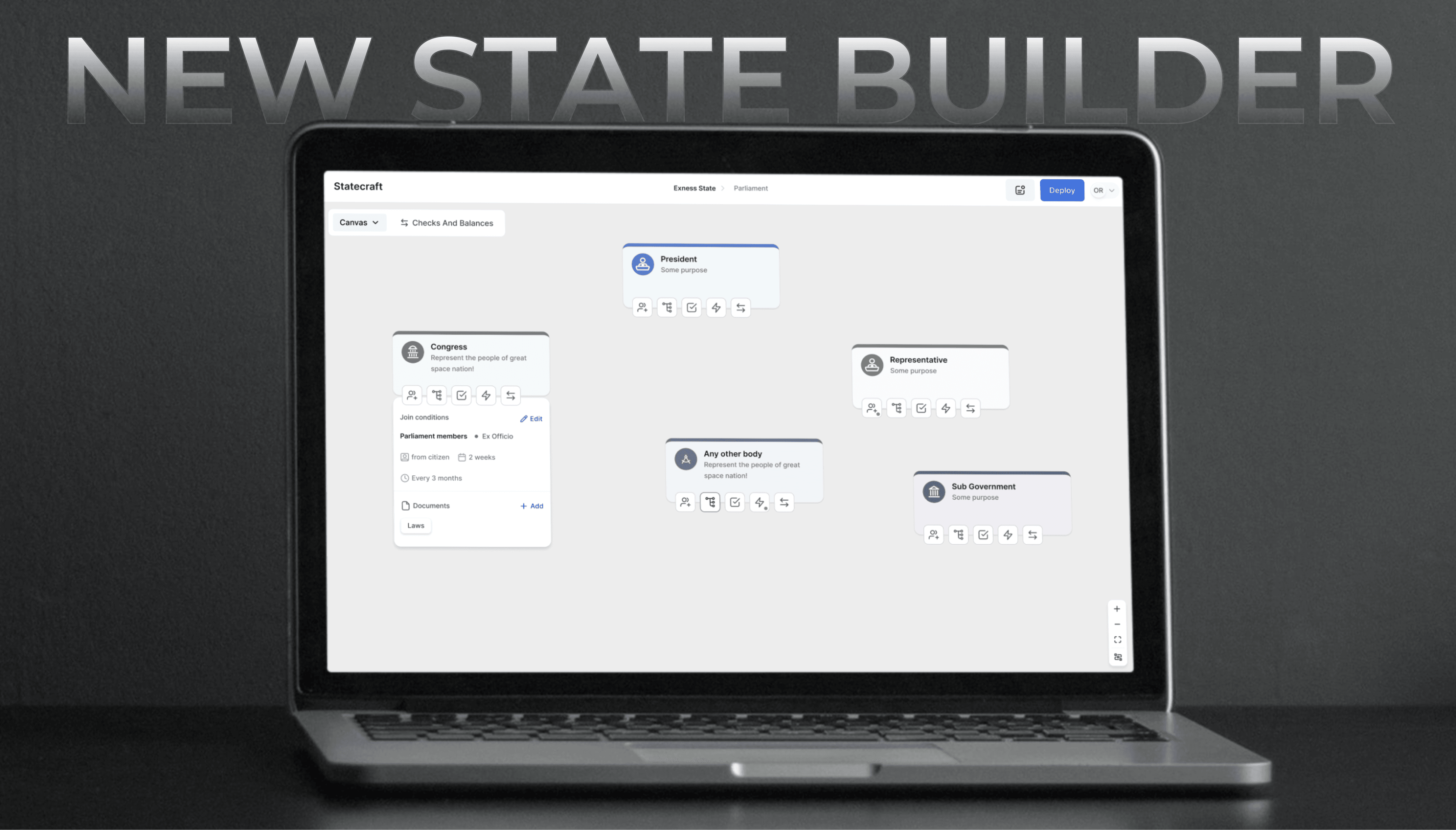 Statecraft enables online communities to explore novel governance models using drag-and-drop tools and deploy them on blockchain with built-in checks and balances for authority and voting transparency.